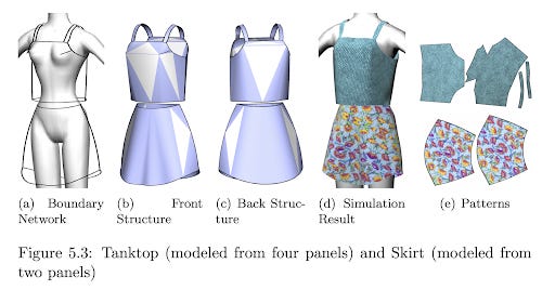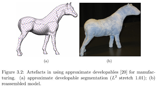 Plenty of research has been done on algorithms to approximate 2D sewing patterns for 3D surfaces using this purely geometric understanding of how fabric behaves. These algorithms will intelligently section off 3D surfaces into low-curvature sub-regions (from our pizza analogy— slices with at least one red line and at most one black line), and then un-bend those regions (straightening the black line) into approximate 2D fabric cuts.